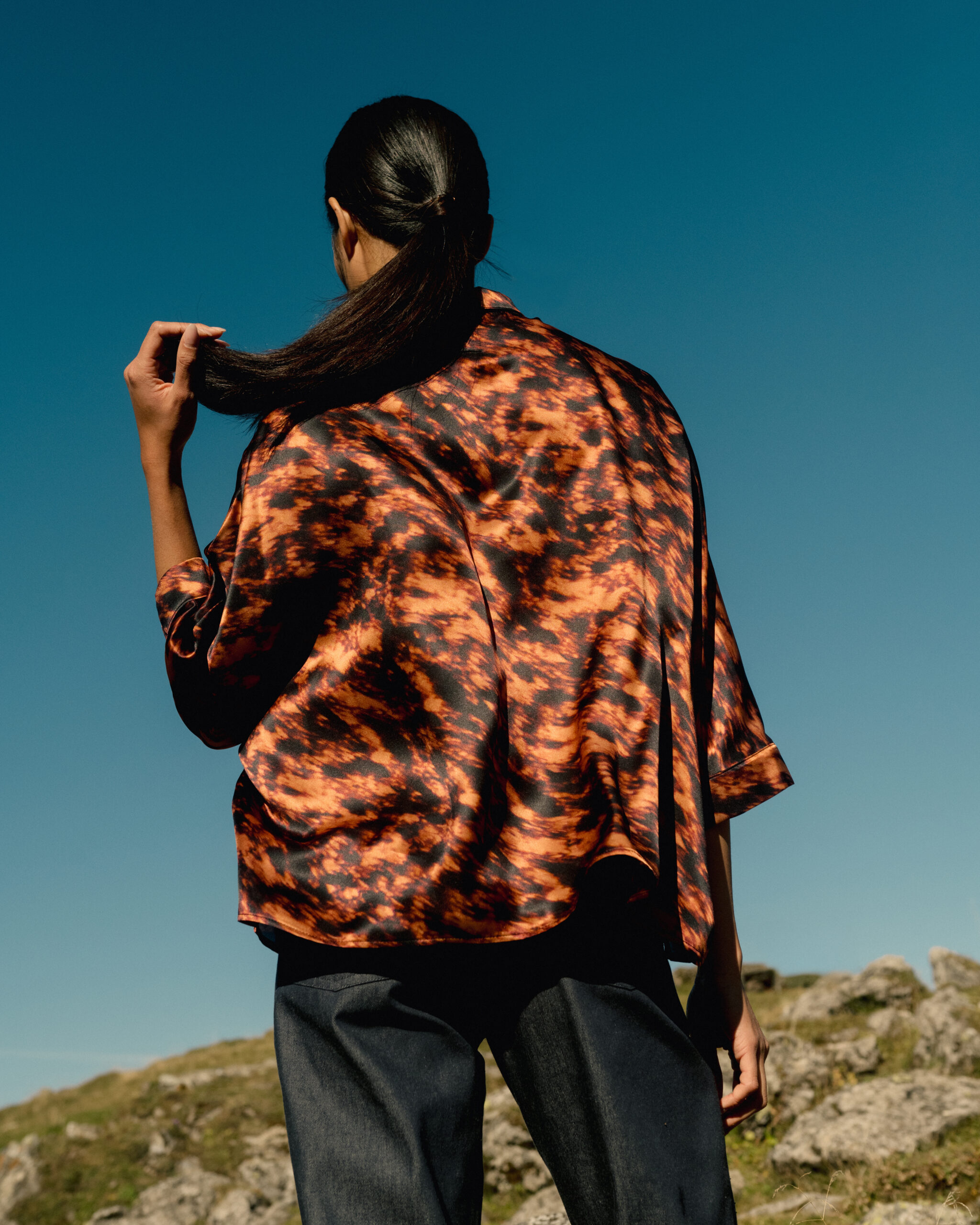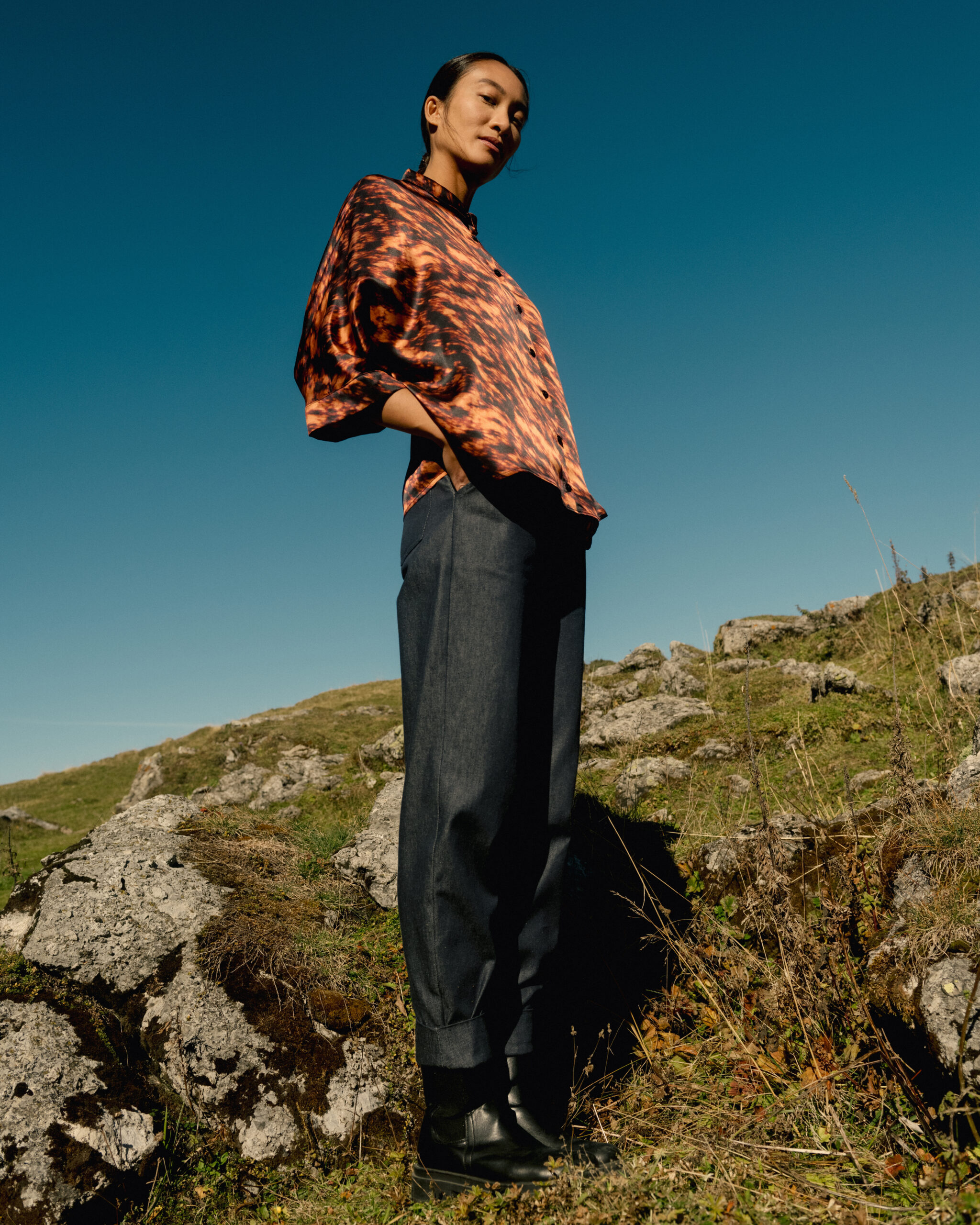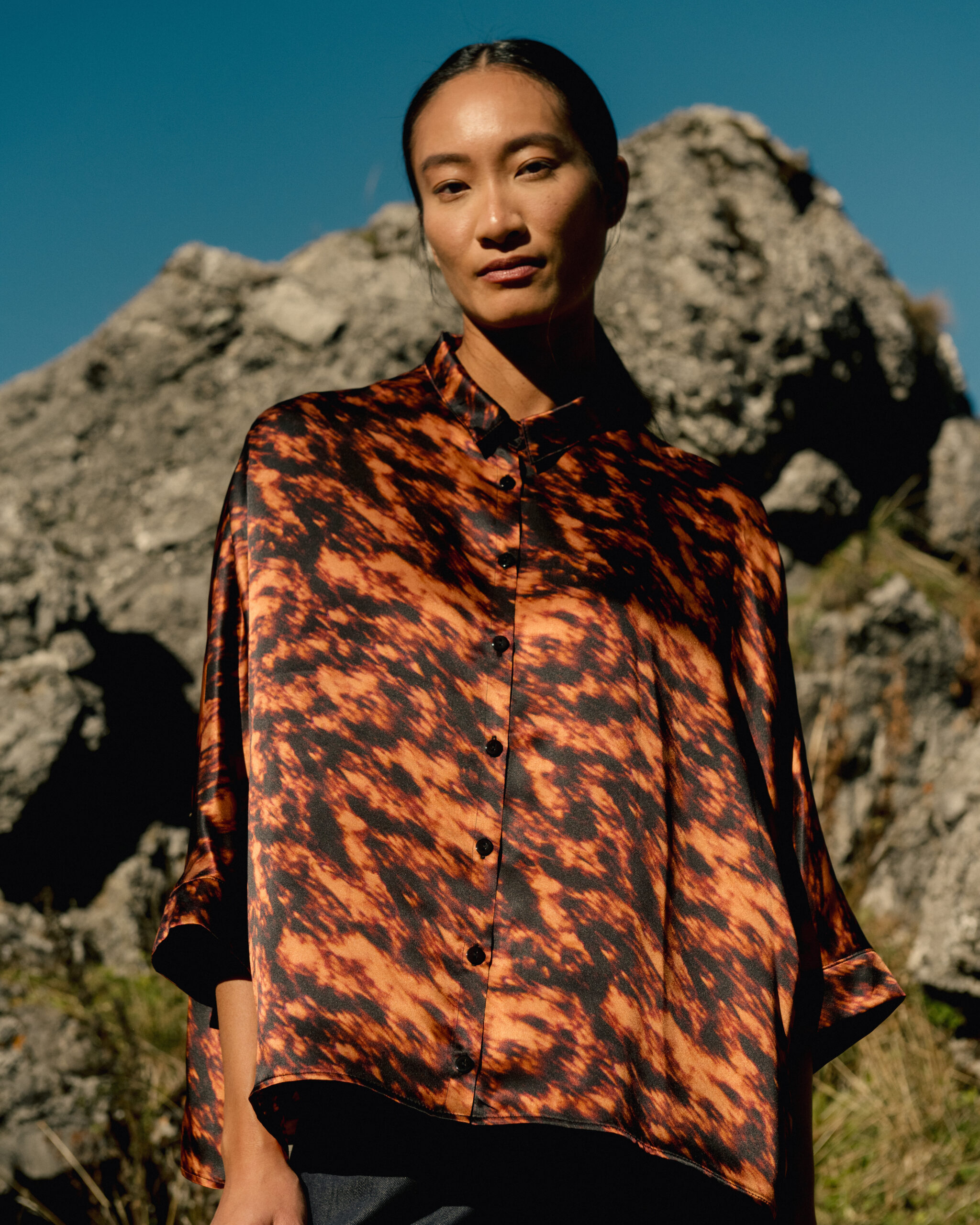 Die hochwertige oversized Seidenbluse mit 3/4-Ärmeln und Knopfleiste überzeugt durch unseren eigenen Print aus dem Projekt Seide auf Seide, der in Zusammenarbeit mit der Biologin Guyslaine Thalmann und der Textildesignerin Emanuela Zambon entstanden ist. Basis dafür bildet eine Mikroskopieaufnahme des unteren Flügels des Maulbeerspinners. Die filigranen Strukturen und Schuppen des Flügels wurden in einem kreativen Prozess in ein Stoffmuster übersetzt, das die natürliche Ästhetik aufgreift und neu interpretiert. Der gerade, weite Schnitt macht die Bluse vielseitig tragbar und schmeichelt unterschiedlichsten Figuren.